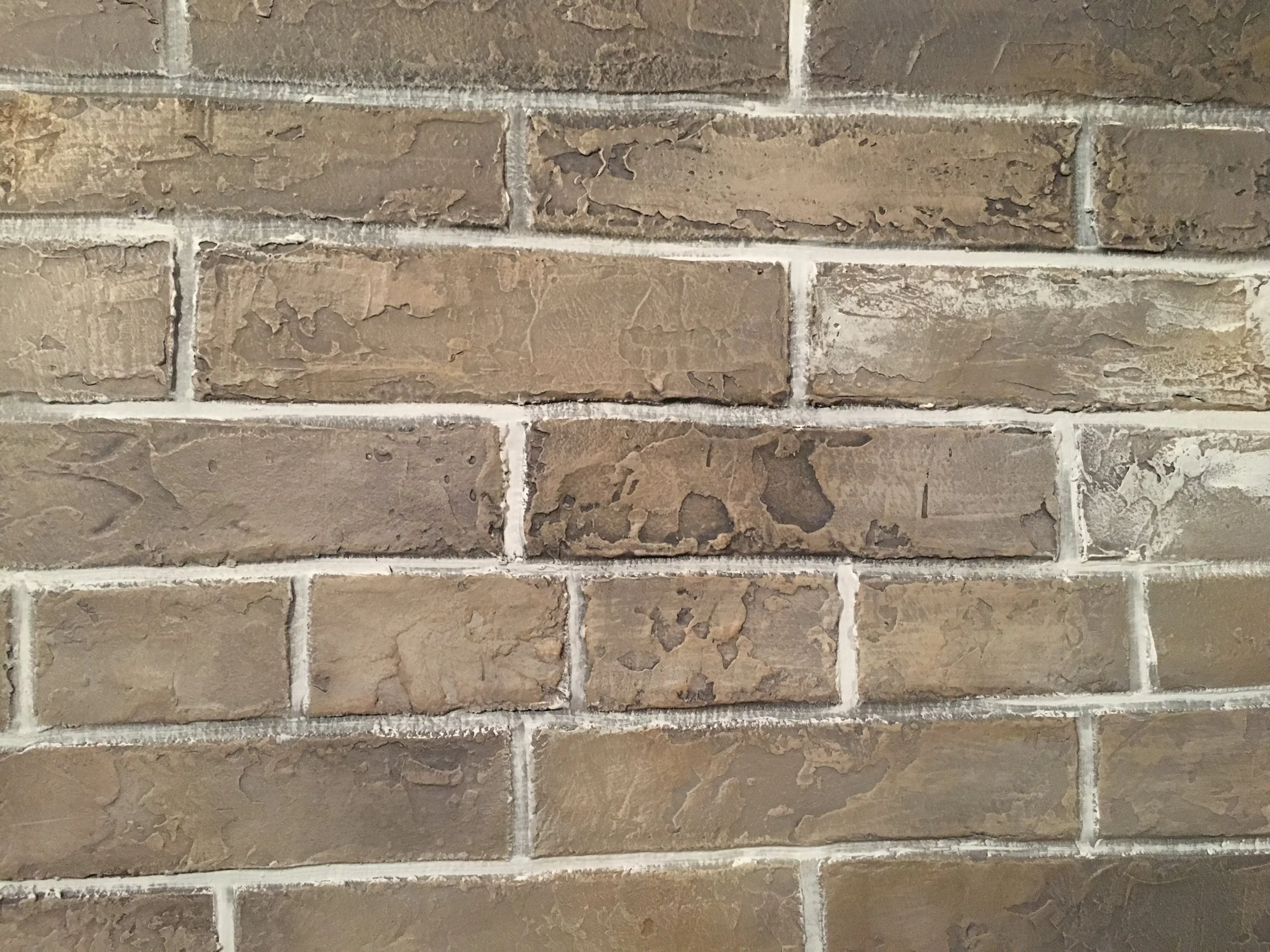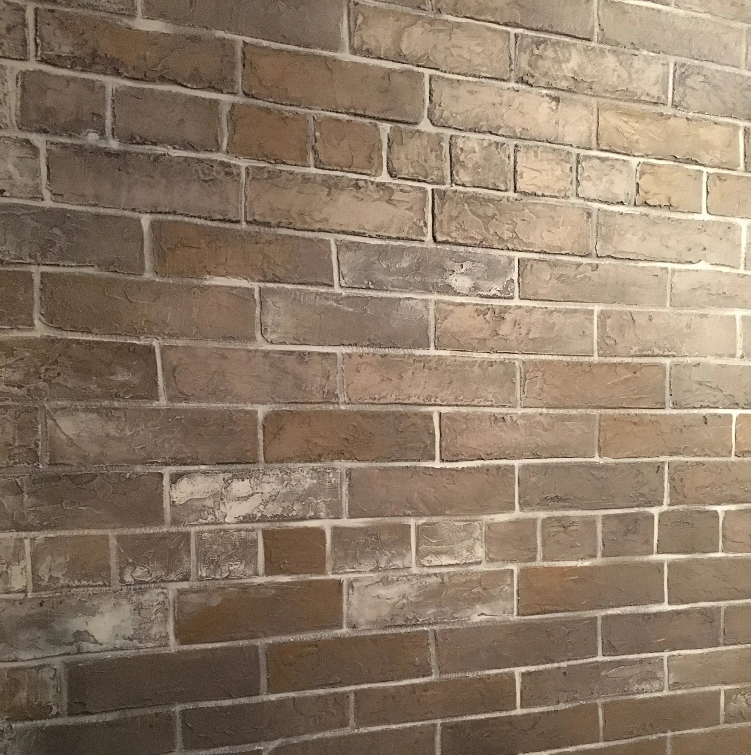 I applied a thick layer of plaster to the wall and I scribed all the grout lines by hand. Once dried I added multiple layers of glaze to create a realistic brick look.